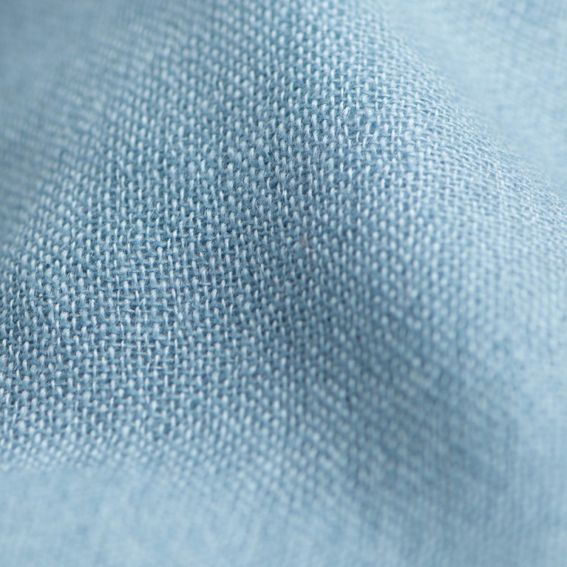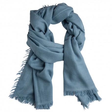Dueblått sjal i lerretveving. Sjalet er håndvevd i kasjmir med frynser på alle fire sider.