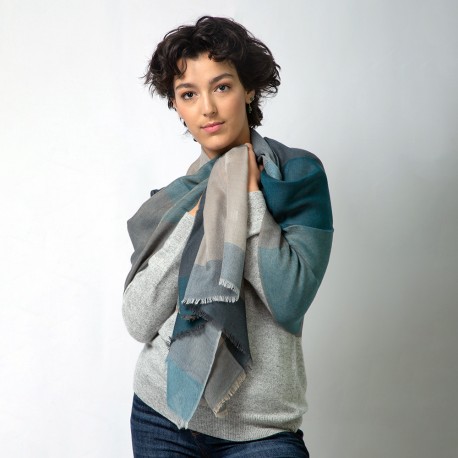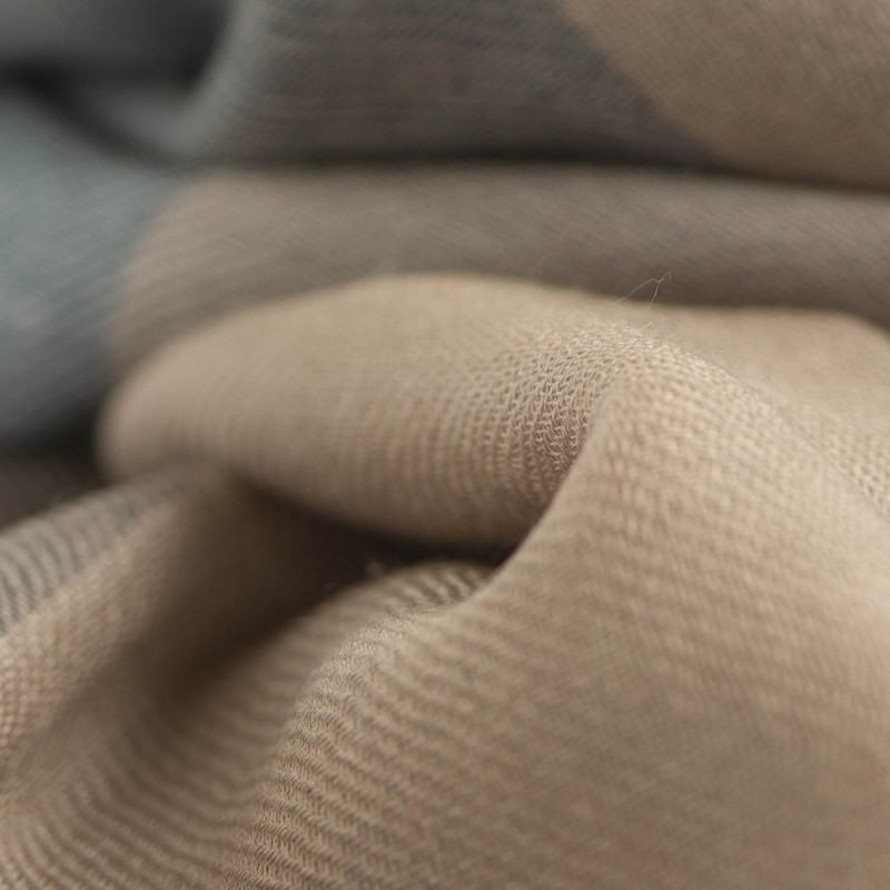 Kasjmirskjerf i blått, karamell, beige og grått.
