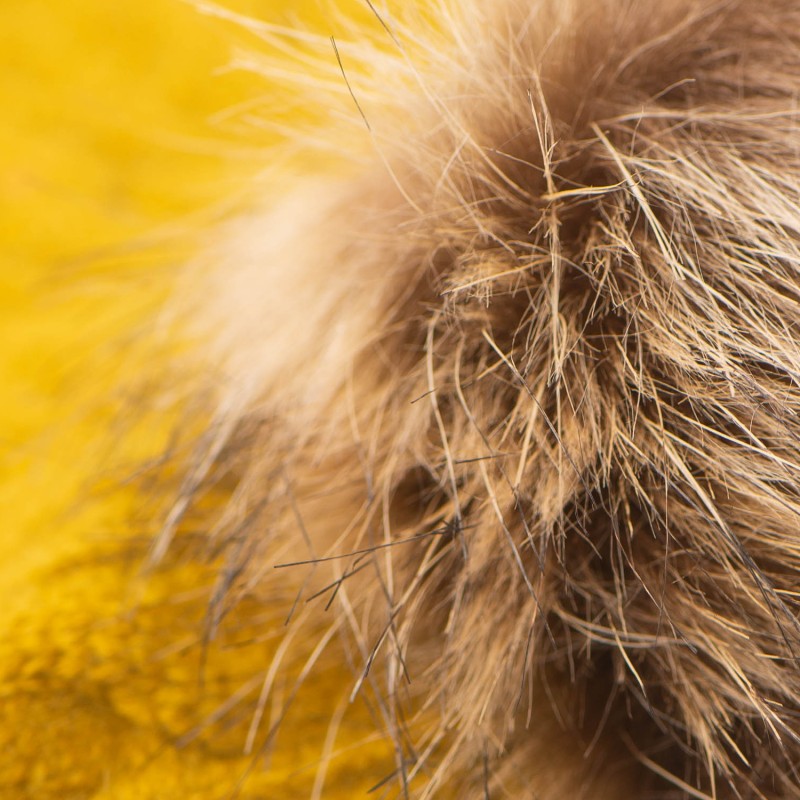 Karrigul strikkelue i kasjmir med dusk.