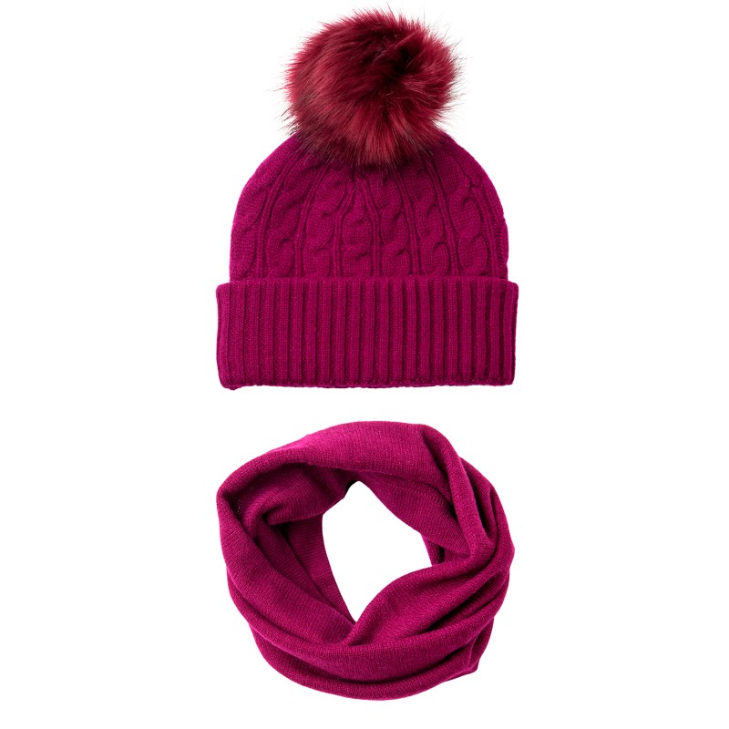 Nydelig sett bestående av plommefarget kabelstrikket lue med dusk samt halsvarmer. Begge er laget av ren kasjmir. Et perfekt sett for høst og vinter.