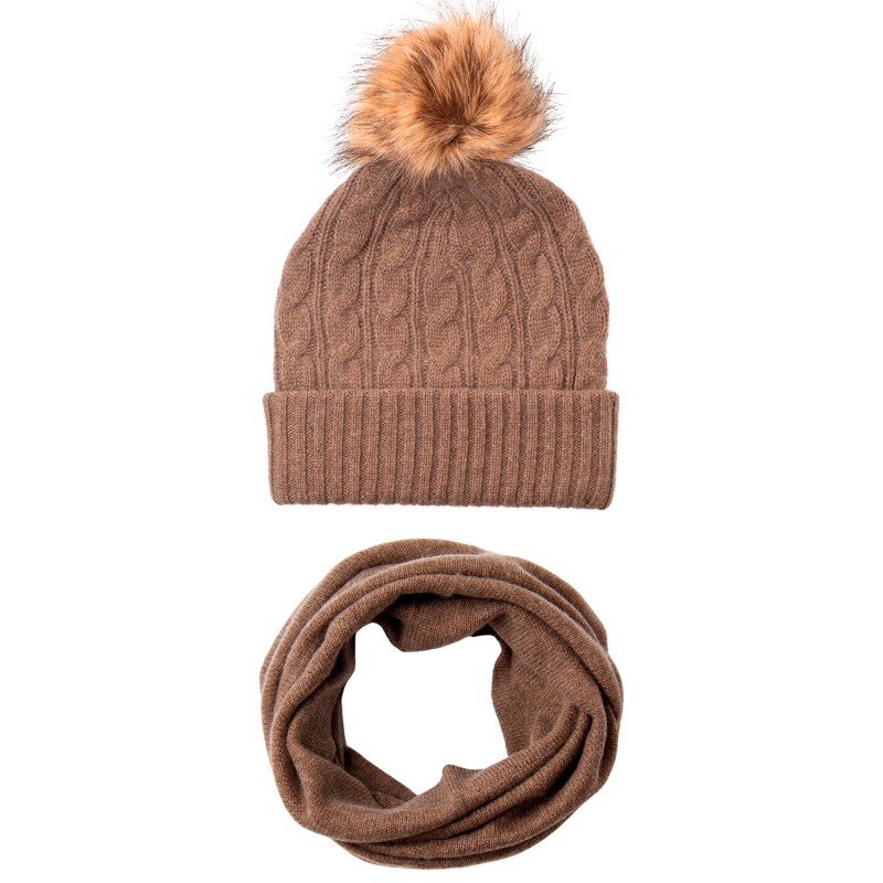 Nydelig sett bestående av taupegrå kabelstrikket lue med dusk samt halsvarmer. Begge er laget av ren kasjmir. Et perfekt sett for høst og vinter.